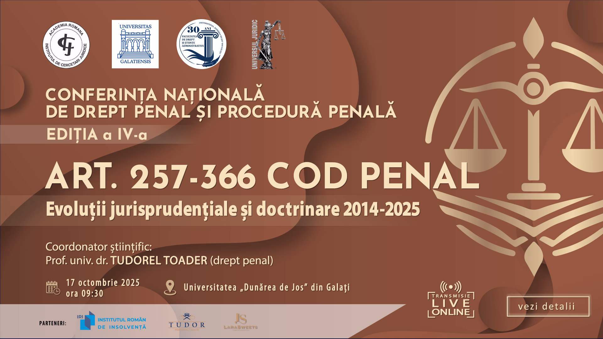 Institutul de Cercetări Juridice „Acad. Andrei Rădulescu” al Academiei Române, în parteneriat cu Universitatea „Dunărea de Jos” din Galați și Grupul editorial Universul Juridic, organizează, în data de 17 octombrie 2025, CONFERINȚA NAȚIONALĂ DE DREPT PENAL ȘI PROCEDURĂ PENALĂ. Ediția a IV-a – Art. 257-366 Cod penal. Evoluții jurisprudențiale și doctrinare 2014-2025, începând cu ora 09:30, în Aula Magna a Universității „Dunărea de Jos” din Galați.